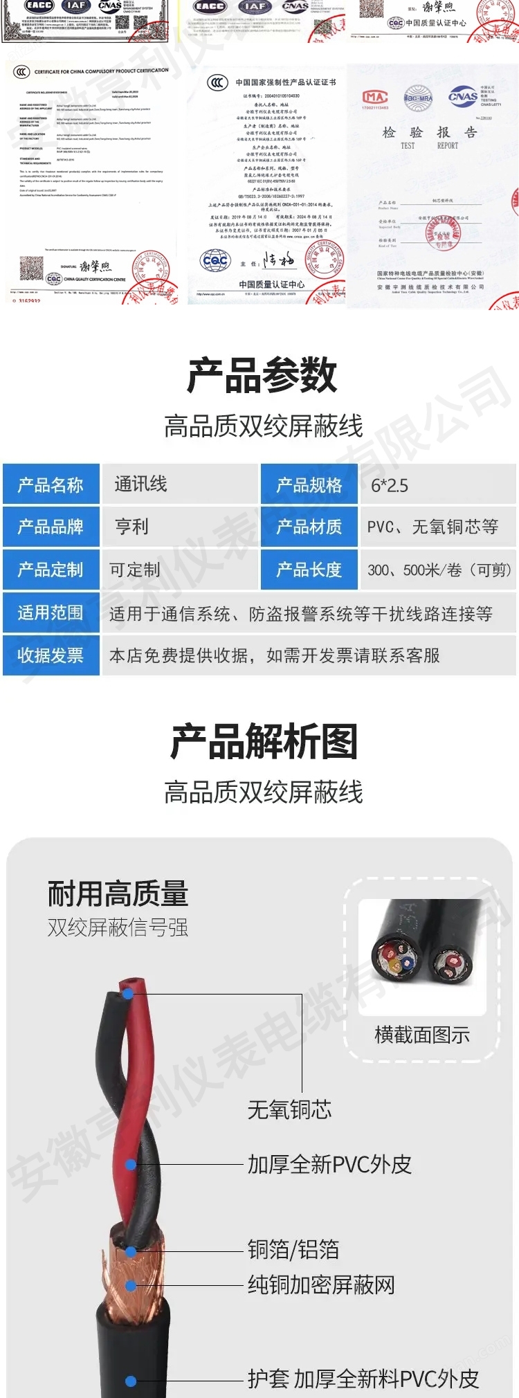 제품 설명: 차폐 쌍교선, 도체는 2 * 2 * 22AWG 여러 가닥의 주석 도금 전해 동사를 교합하여 만든 것으로, 꽃색 PP 절연 커버는 설치 식별에 적합하며, 각 쌍의 선 쌍은 모두 알루미늄 포일/폴리에스테르 벨트 전체 99.9% 차폐, 추가 독립적인 여러 가닥의 교합 주석 도금 동사 접지 도체, 산업 회색 PVC 외부 커버가 있다.